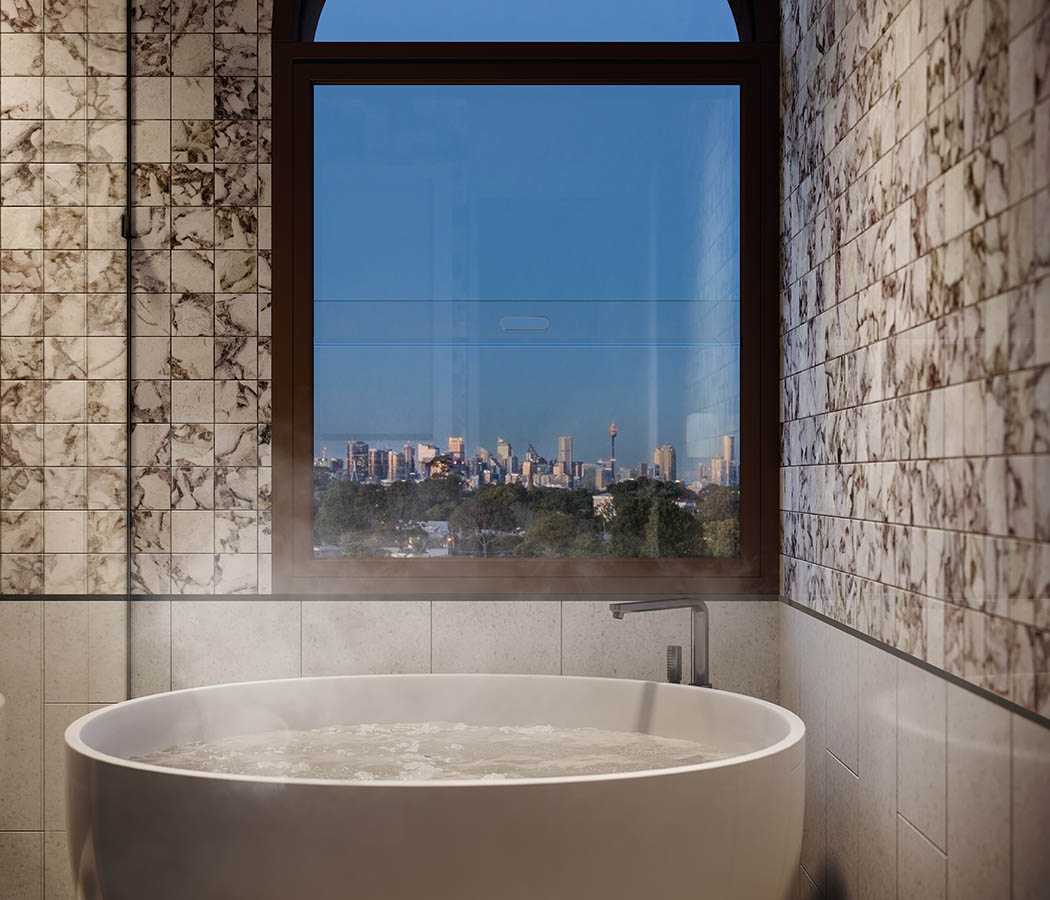 The bathrooms and ensuites at Ashbury Terraces have been crafted without compromise. Rich materiality and luxurious stones have been paired with considered details and finishes to create an indulgent space for you to unwind. Large windows create an abundance of natural light and are complemented with frameless showers featuring dual and hand-held shower heads, a free-standing bath and double vanities.